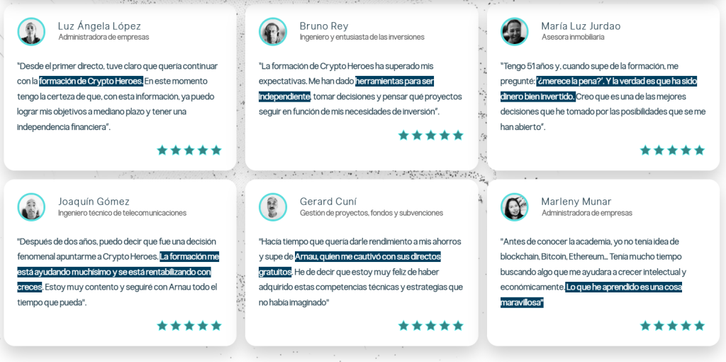 Muy pocas formaciones cuentan con la cantidad de alumnos satisfechos que tiene Crypto Heroes Pro. Eso sí, guiándonos por las reseñas, análisis y testimonios que tú mismo puedes encontrar por internet.